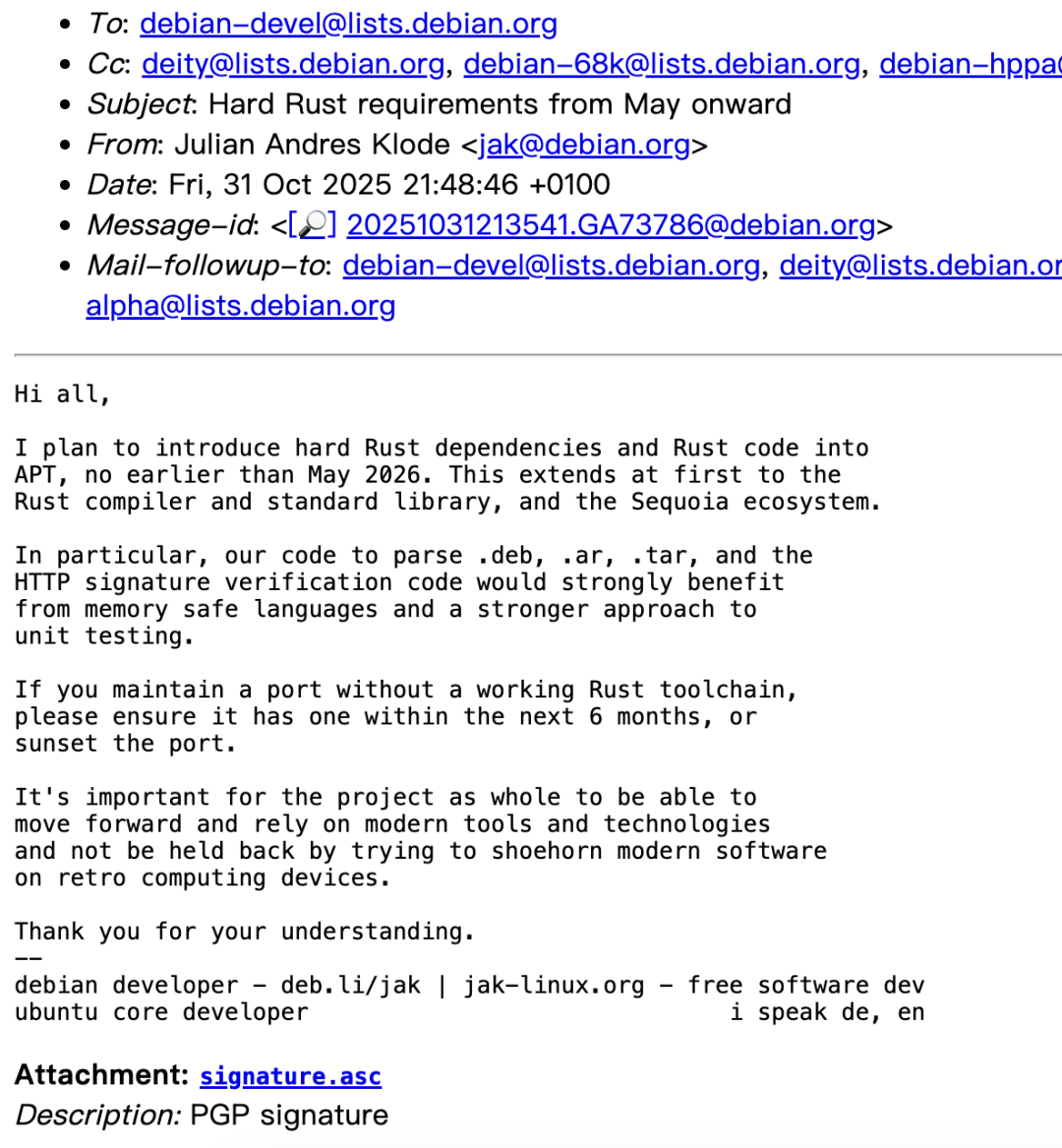 对工具链中列出的部分采用 Rust 的安全性理由确实很有道理,而且对于一些架构,比如 m68k,其他操作系统上已经有 Rust 端口,因此这些平台实现支持不应太难。直言道:“真是让人尴尬,完全无法理解。因为这意味着 Debian 的所有架构都必须支持 Rust,而目前一些尚未具备 Rust 支持的端口,要么需要尽快开发支持,要么可能淘汰。对我来说,这很清楚:要么在六个月内有开发者站出来修复这些端口